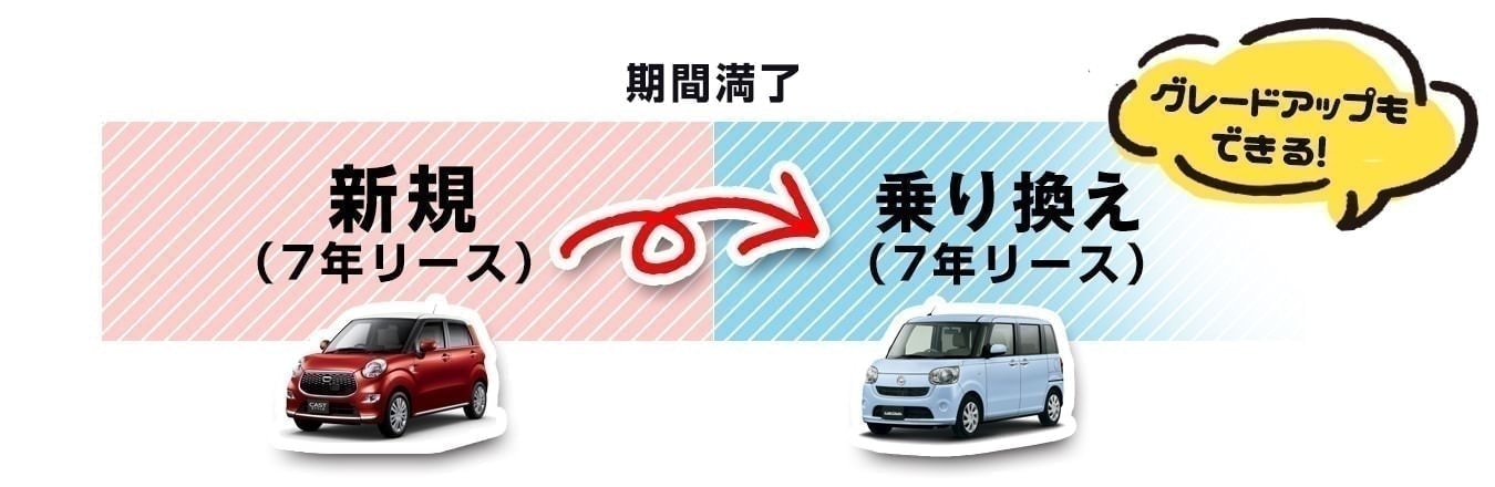 1期目のリース契約の残価を精算し契約満了後、2期目として新たにカーリース契約ができます。もちろん異なる車種の新車にも乗り換えることができ、グレードアップも可能なので一番人気の選択肢です。